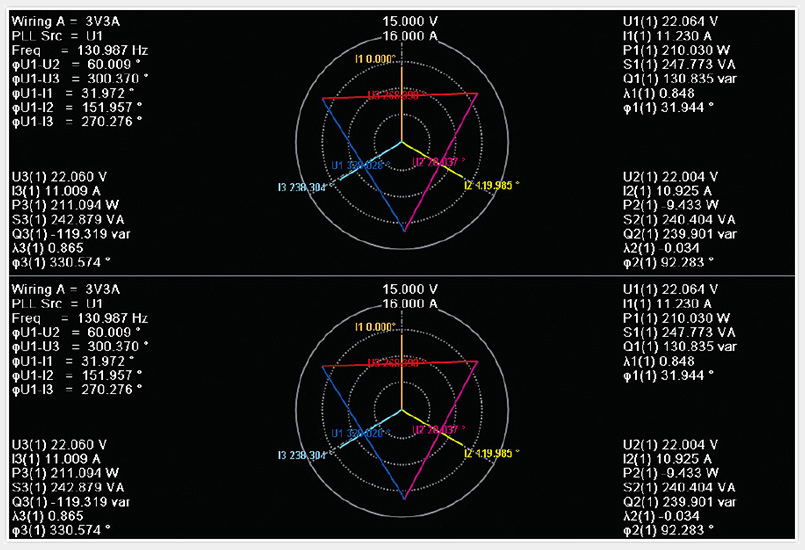 PA5000H功率分析仪可同时测量并显示变频器输入三相与输出三相的矢量图,可对输入、输出各相间的相角关系进行分析,准确评估出输入信号对输出信号的角差影响。(所有型号均能满足)