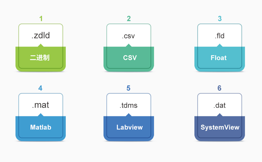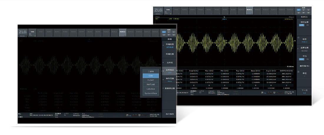 除了标准的格式之外,ZDL5000示波记录仪还支持直接导出二进制、CSV、FLOAT、matlab、labview、SystemView等标准格式,用户可以直接使用数据的标准文件进行深层次的数据分析,无论是数据二次回读、开发软件分析都十分便捷。
