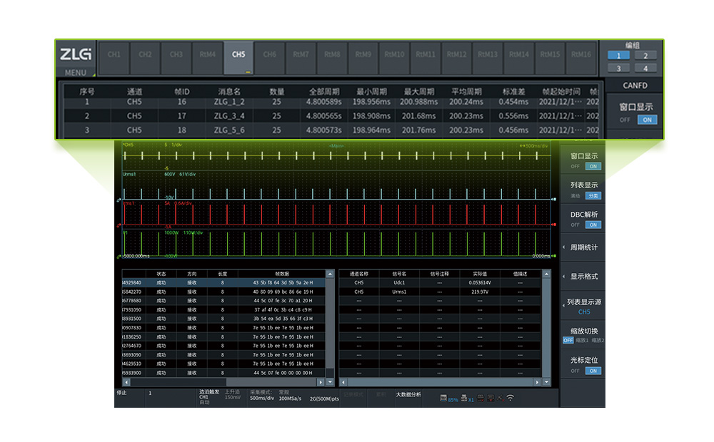 ZDL5000示波记录仪配合CAN 接口模块可以实现对CAN 信号的同步测试,通过加载DBC 文件可以对新能源汽车的CAN信号进行数字转化,从而达到对CAN报文统计分析的能力。